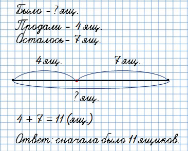 2. У продавца было несколько ящиков с помидорами. Когда он продал помидоры из 4 ящиков, осталось 7 ящиков с помидорами. Сколько ящиков с помидорами было у него сначала? Запиши задачу кратко, сделай к ней схематический чертёж и реши её.