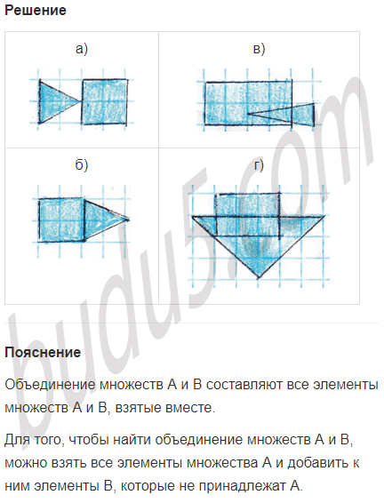 Задание № 10. Нарисуй треугольник и четырёхугольник, пересечением которых являются: а) точка; б) отрезок; в) треугольник; г) четырёхугольник. Закрась синим цветом объединение этих фигур.